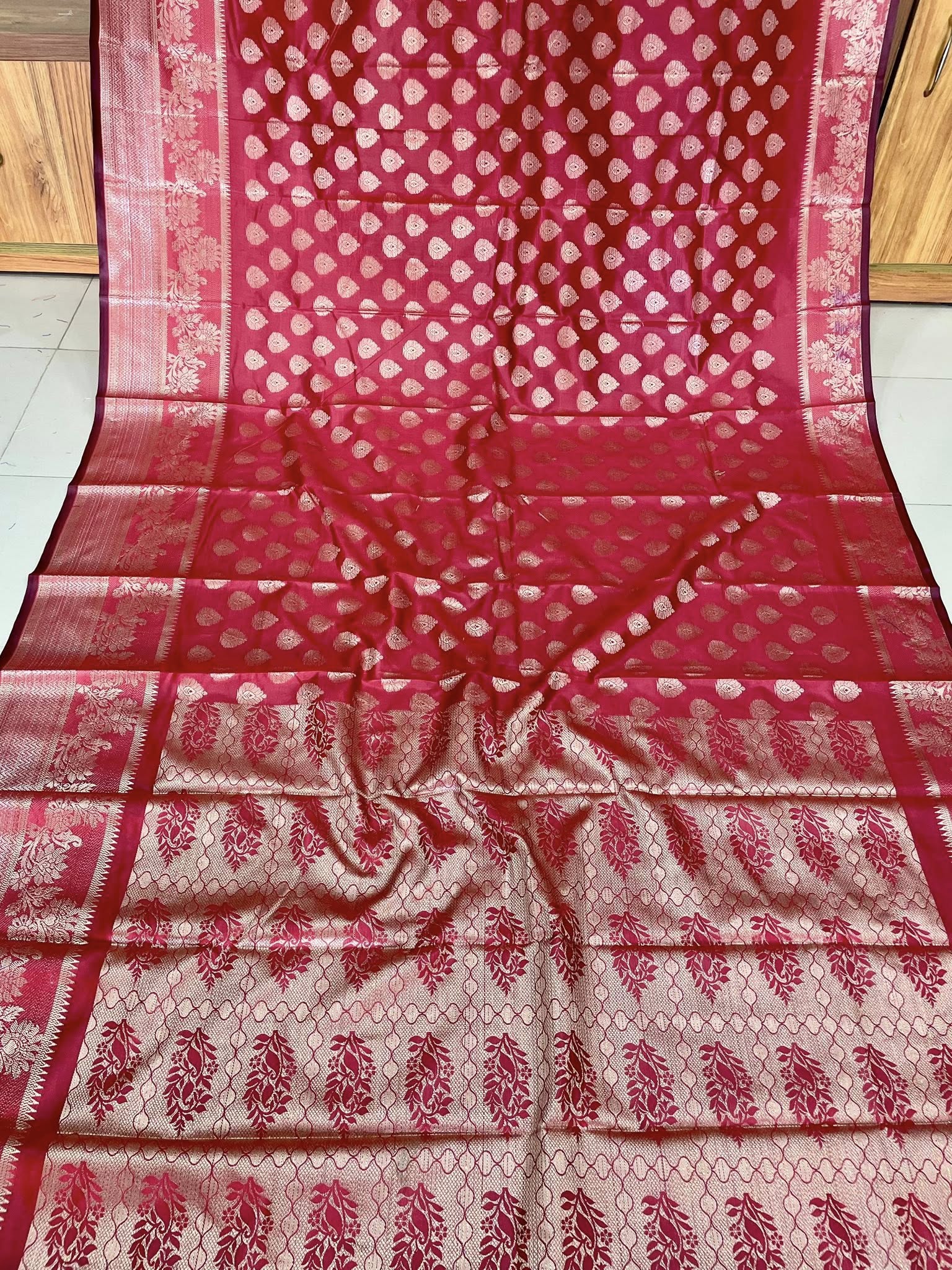 এই শাড়ির গাড় লাল-গোল্ডেন কনট্রাস্ট লুক যেকোনো স্কিন টোনে সুন্দর মানায়।