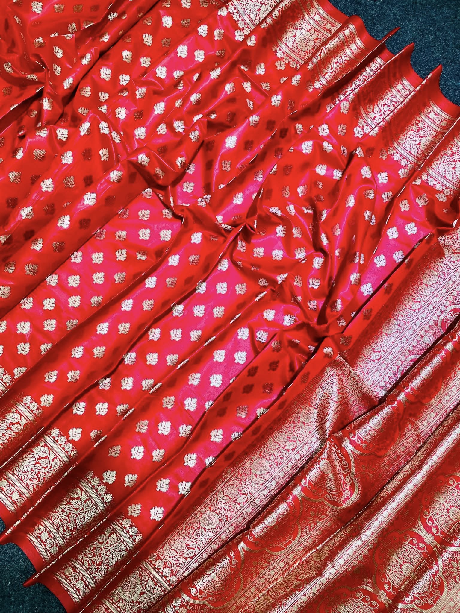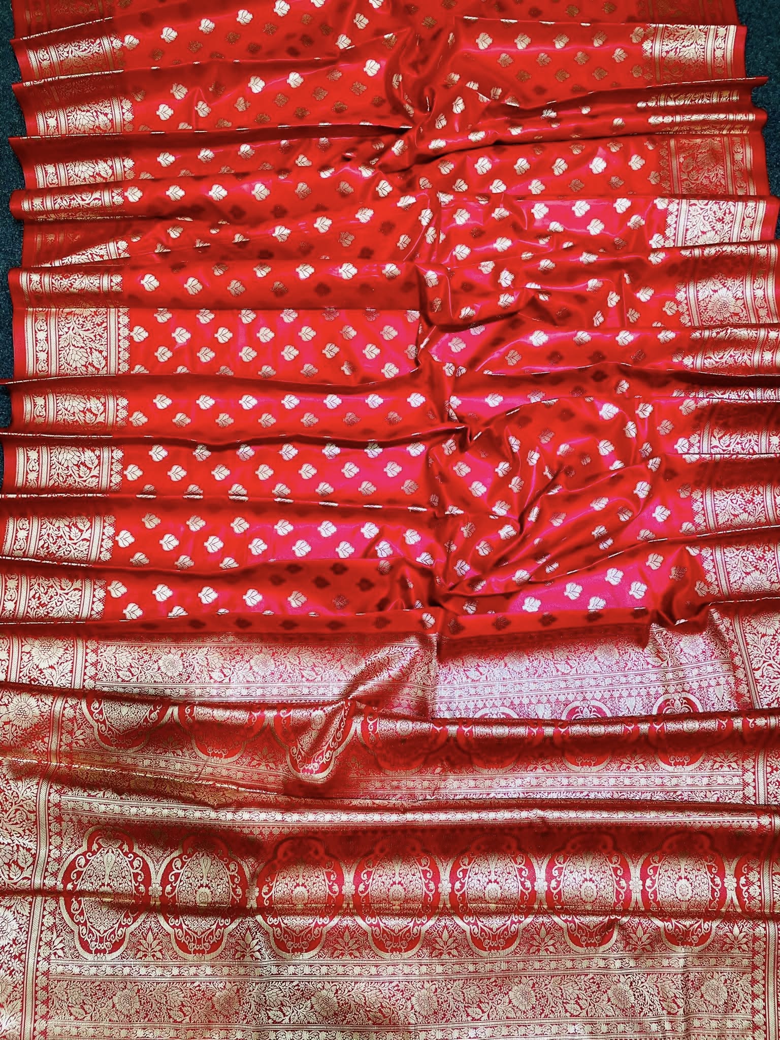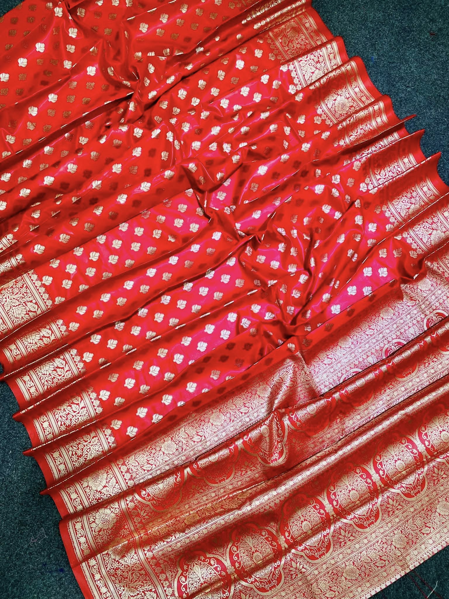 এই সুন্দর Shoft shilk katan saree লাল রঙের উপর গোল্ডেন ফুলেল বর্ডার ডিজাইন ও ছোট ছোট ফুলের কারণে একদমই ইউনিক ও এলিগ্যান্ট লুক দেয়। পুরো শাড়িজুড়ে দেওয়া গোল্ডেন ফুলের প্যাটার্ন এটিকে আরও আকর্ষণীয় করে তোলে।