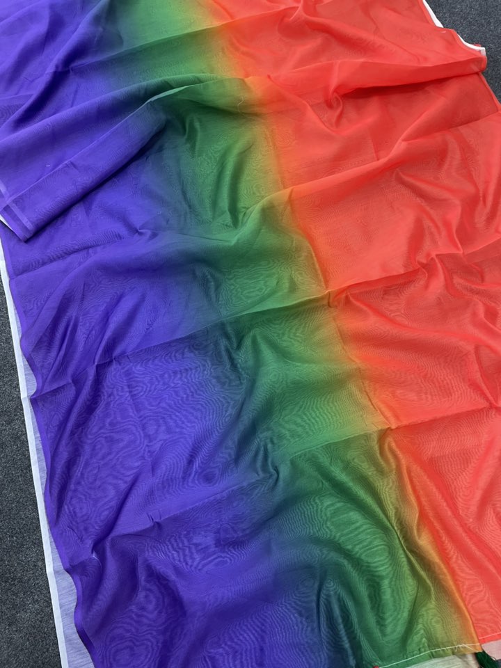 এই শাড়িটি একটি দৃষ্টিনন্দন মাল্টিকালার সিল্ক শাড়ি, যেখানে সবুজ, কমলা ও বেগুনির সুন্দর শেড ওম্ব্রে স্টাইলে একসাথে মিশে একটি অনন্য প্রিমিয়াম লুক তৈরি করেছে। যেকোনো উৎসব, পার্টি, বিয়ে কিংবা বিশেষ অনুষ্ঠানে পরার জন্য এটি হবে একটি পারফেক্ট চয়েস।