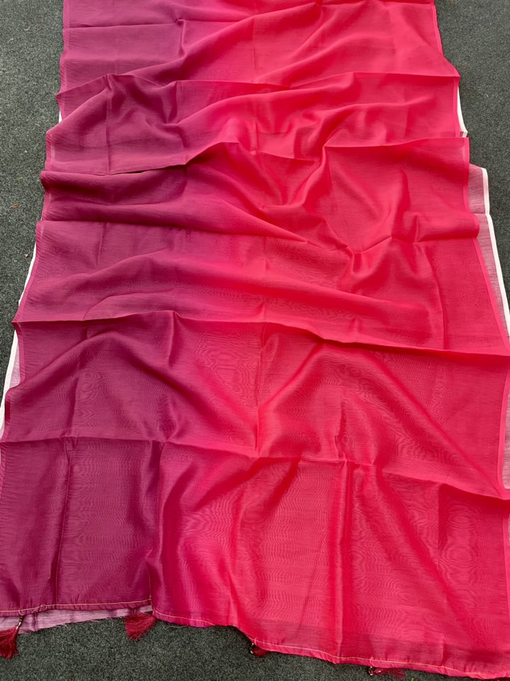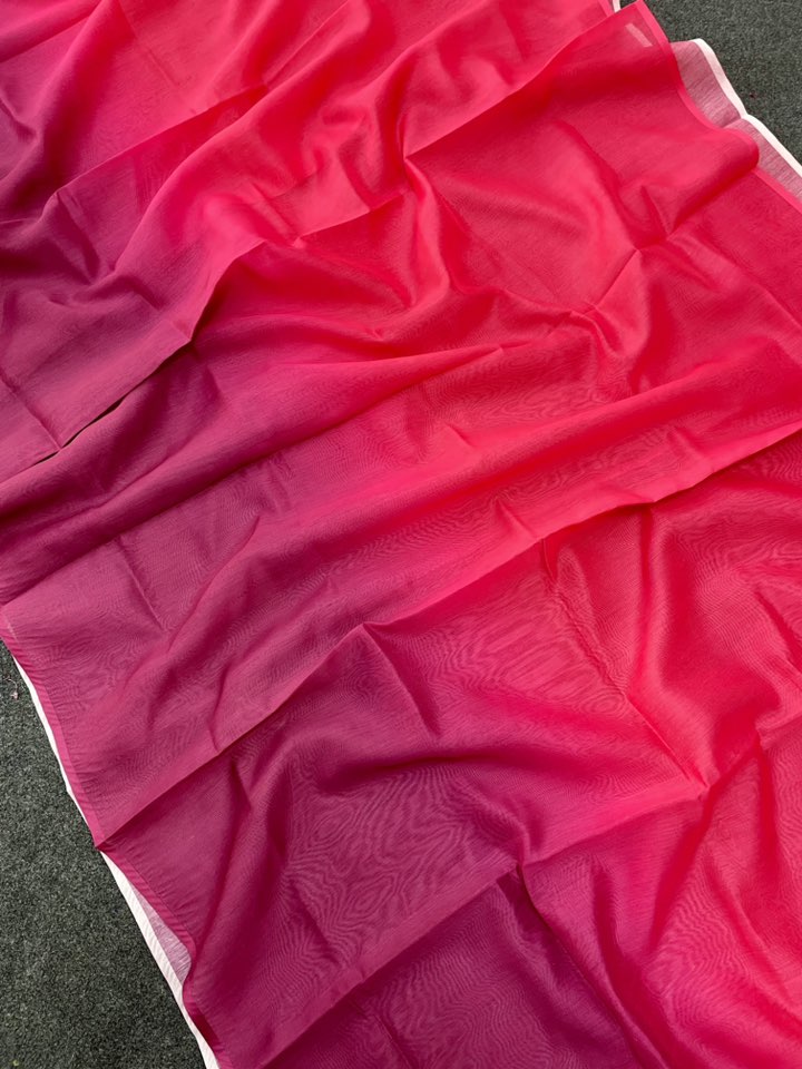This beautiful multicolor silk saree features a stunning blend of pink and magenta shades in a smooth ombre finish. The soft, lightweight fabric gives a graceful drape, making it ideal for parties, weddings, festive events, and traditional occasions. The elegant pallu with deep magenta tones adds a rich and classy touch.