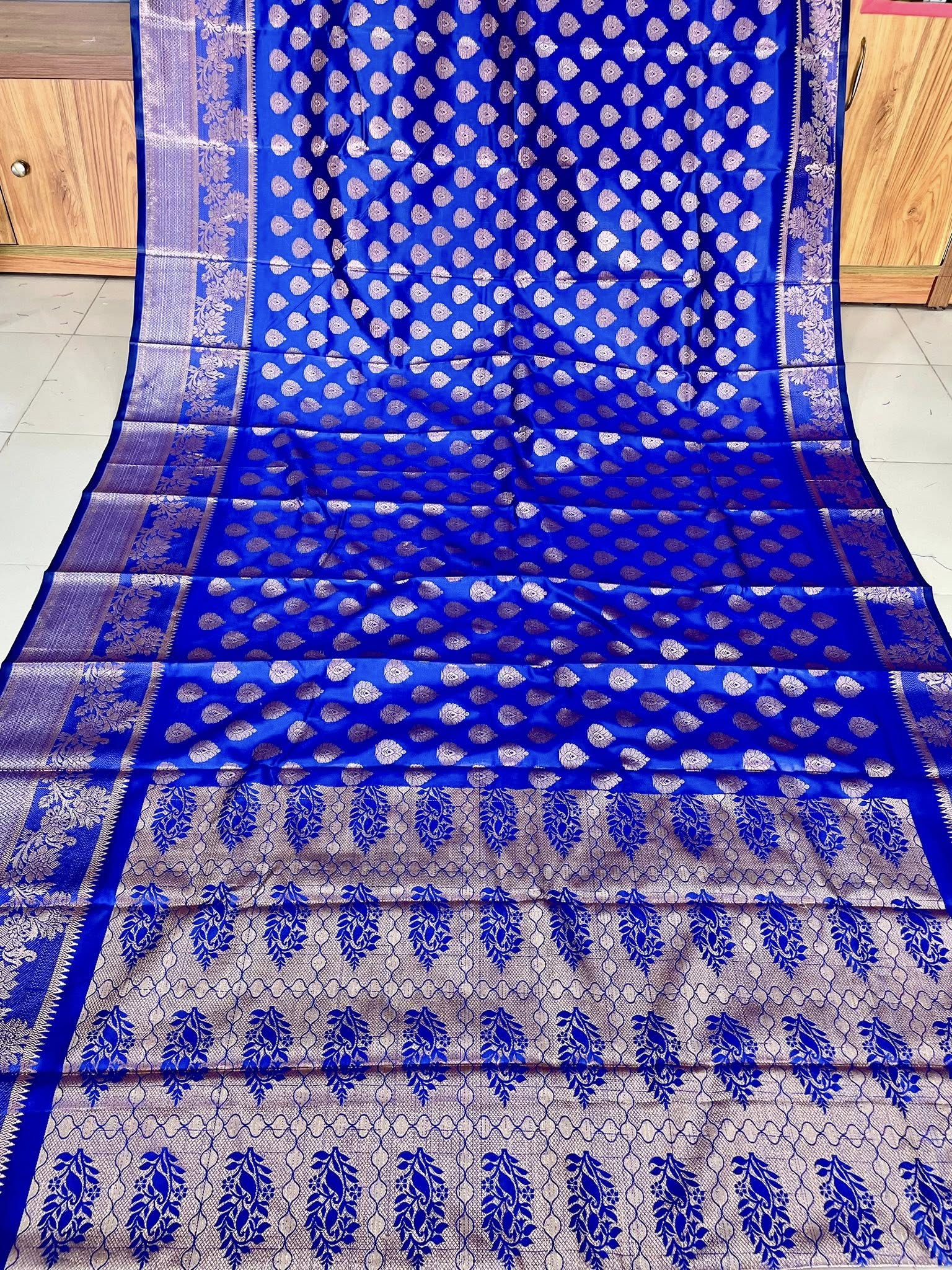 এই সুন্দর Shoft shilk katan saree নীল রঙের উপর গোল্ডেন ফুলেল বর্ডার ডিজাইন ও ছোট ছোট ফুলের কারণে একদমই ইউনিক ও এলিগ্যান্ট লুক দেয়। পুরো শাড়িজুড়ে দেওয়া গোল্ডেন ফুলের প্যাটার্ন এটিকে আরও আকর্ষণীয় করে তোলে।